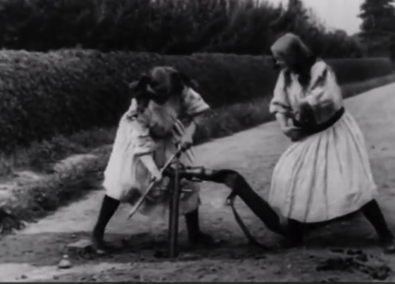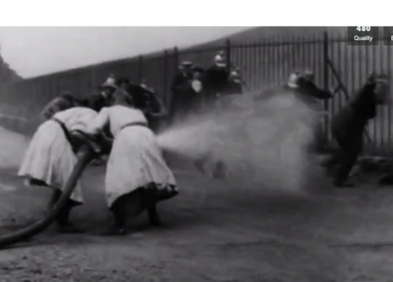Tomboys drive a fire engine through a fairground and hose the firemen.